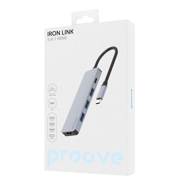 El Proove Iron Link 5 en 1 es un dispositivo completo con tres puertos USB 3.0 para una rápida transmisión de datos, un conector Tipo C para una carga PD3.0 eficiente y un puerto HDMI para una transferencia de imágenes de alta calidad.