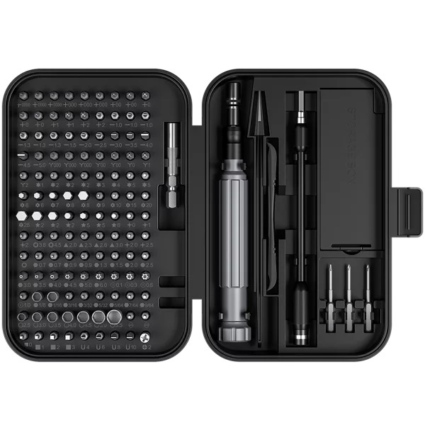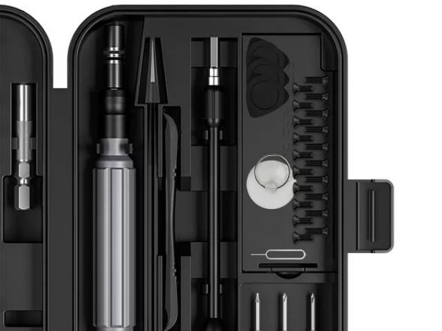 un destornillador con puntas intercambiables, puntas, pinzas, una ventosa, una llave para la bandeja de la tarjeta SIM y un perforador.